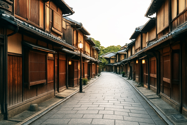 A quiet, historic street in Kyoto with traditional wooden buildings